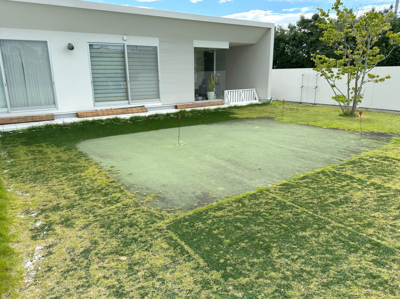 以前ご自身で施工されたパターグリーンの張り替えとパターグリーン周りの天然芝も人工芝に変えたいとのご依頼をいただきました。パター周りの芝は天然芝に近い見た目をご希望されておりましたので、鮮やかな色合いのデラックス芝丈28mmをご提案。面積も広いため、人工芝の範囲など入念にお打ち合わせさせていただきました。