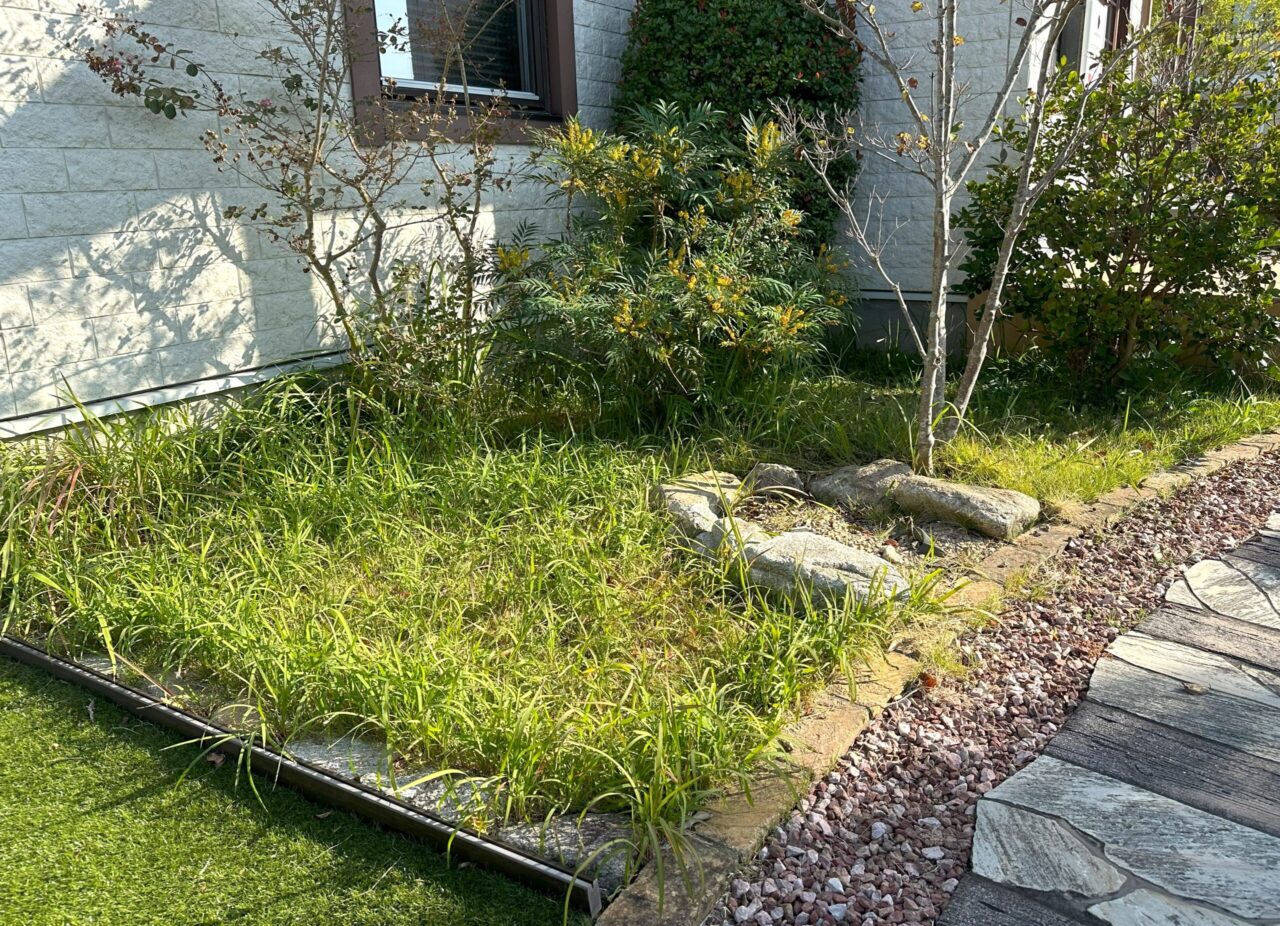 お家周りの雑草処理が追い付かなくなり、人工芝をご検討されたそうです。なるべく本物の芝に近いリアルな人工芝をご希望でしたので、弊社の人工芝の中でNo,1のリアルさと高級感のあるデラックス芝丈38mmをお勧めさせていただきました。